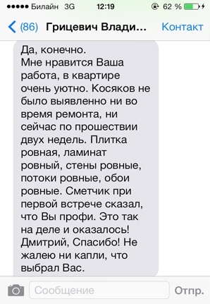 Обычно такие ремонтники возникают как грибы после дождя в пиковые сезоны, и к сожалению благодаря низкой цене их услуги являются очень популярны, и часто с плачевными результатами. Мы всегда подбираем оптимальное для заказчика решение, но никогда не будем искусственно удешевлять или увеличивать стоимость ремонта квартиры в ущерб качеству и долговечности.